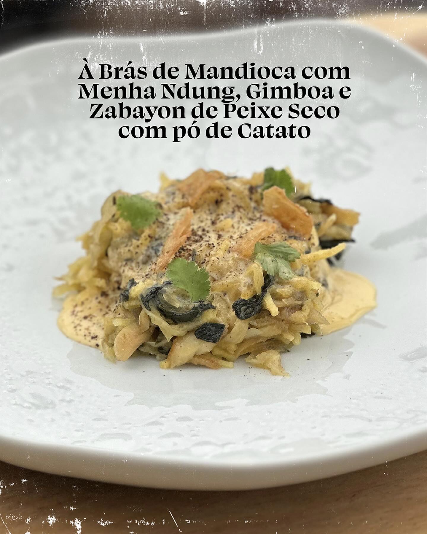 Para o Chefs on Fire propõe um À Brás de Mandioca com Menha Ndung, Gimboa e Zabayon de Peixe Seco com pó de Catato.