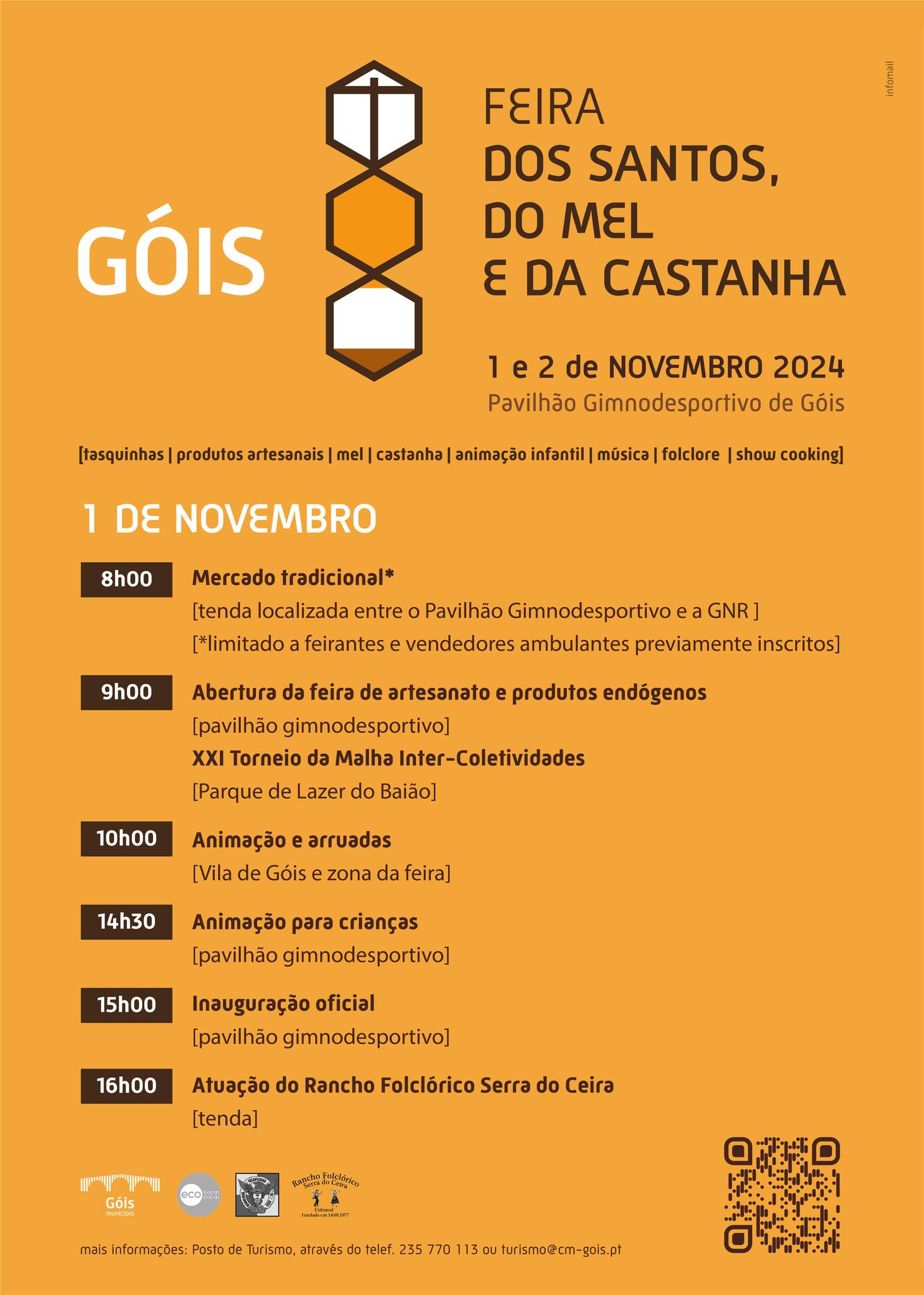 FEIRA DOS SANTOS, DO MEL E DA CASTANHA 2024 | GÓIS – Em Góis, não há outono sem a típica Feira dos Santos, do Mel e da Castanha, este ano, com uma programação de dois dias – 01 e 02 de novembro – recheada de muitas surpresas e animação para toda a família.